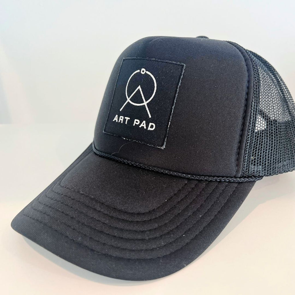 Sleek monochromatic black mid panel foam trucker hat with signature Art Pad patch.